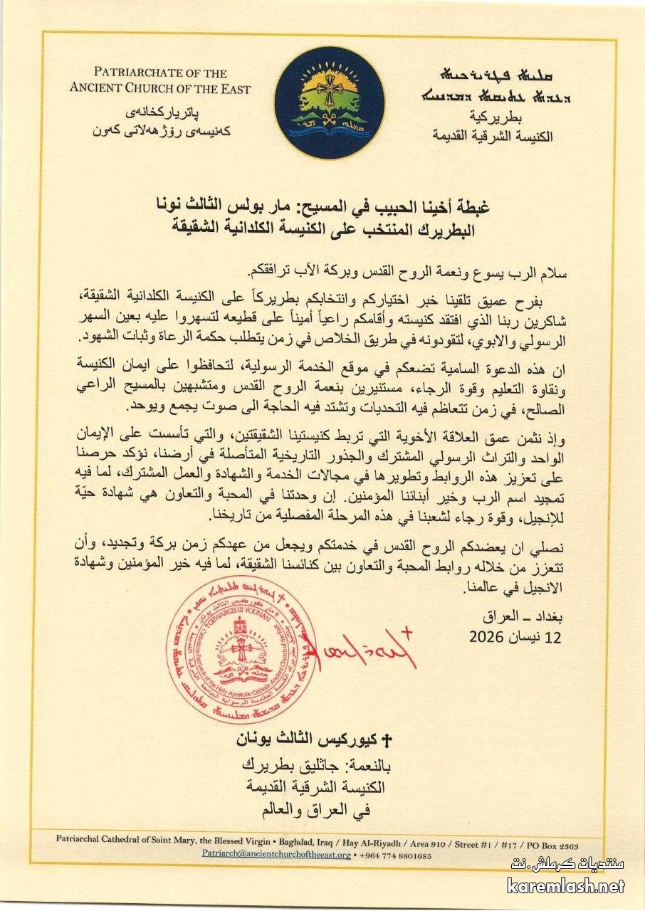 أدناه نص رسالة التهنئة من قداسة البطريرك مار كيوركيس الثالث يونان، بطريرك الكنيسة الشرقية القديمة في العراق والعالم.