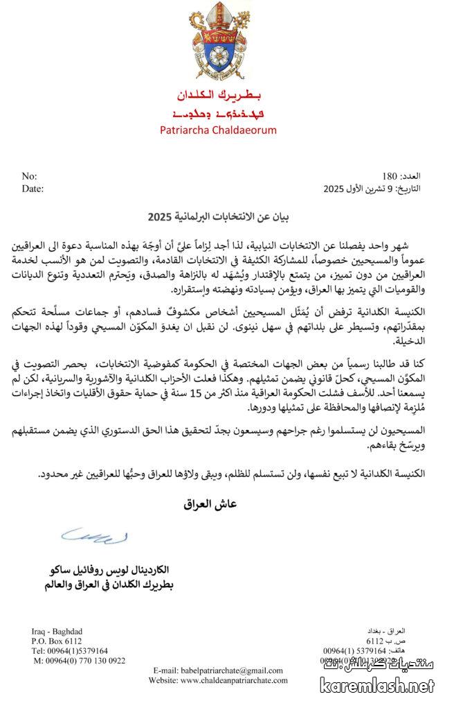 شهر واحد يفصلنا عن الانتخابات النيابية، لذا أجد لِزاماً عليَّ أن أوجّهَ بهذه المناسبة دعوة الى العراقيين عموماً والمسيحيين خصوصاً، للمشاركة الكثيفة في الانتخابات القادمة، والتصويت لمن هو الأنسب لخدمة العراقيين من دون تمييز، من يتمتع بالإقتدار ويُشهَد له بالنزاهة والصدق، ويَحترم التعددية وتنوع الديانات والقوميات التي يتميز بها العراق، ويؤمن بسيادته ونهضته وإستقراره.
